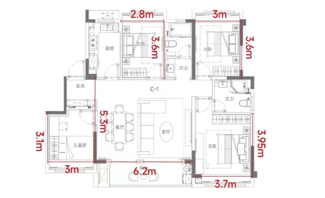 佳運名邸的層高有3米,比市面上的常規(guī)產(chǎn)品要高出20公分左右。以最大的133㎡戶型來算,多了近26 m3的空間,提高居住舒適度的同時也增加了收納空間,讓生活的空間場景有更多可能。